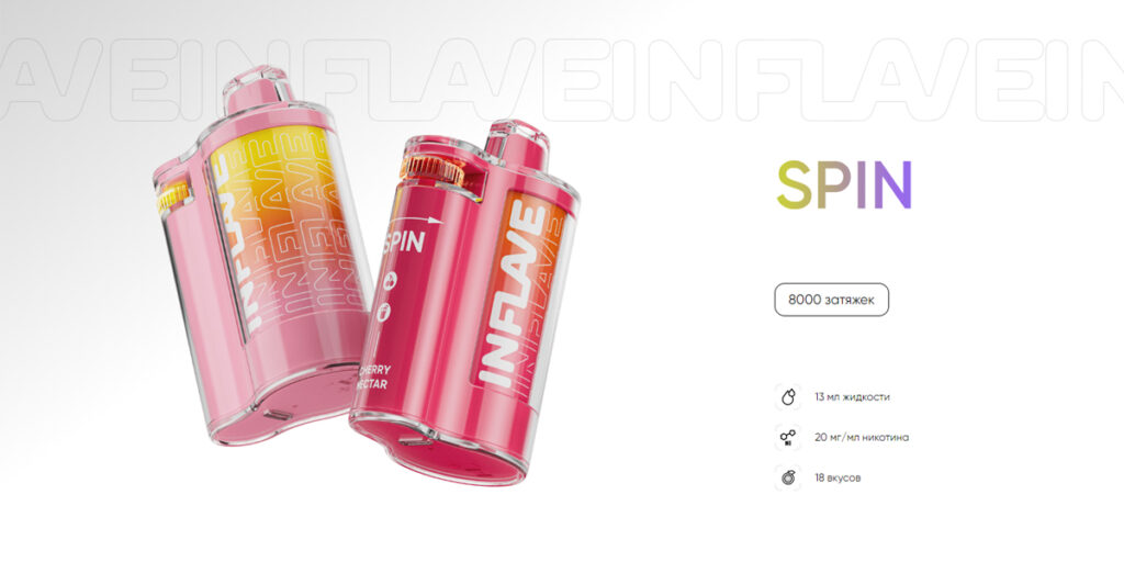 Эта электронная сигарета имеет стильный и современный дизайн с прозрачным корпусом, который демонстрирует внутренние компоненты, придавая им высокотехнологичный вид. Корпус цилиндрической формы с градиентным цветовым решением. Брендинг выделен жирными белыми буквами по бокам. А слово “SPIN” указывает на регулятор тяги. В целом дизайн довольно футуристичен, стильный и привлекательный для пользователей, которые ценят визуальную привлекательность.