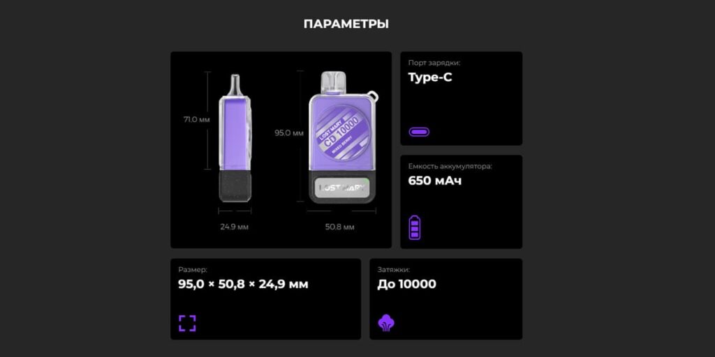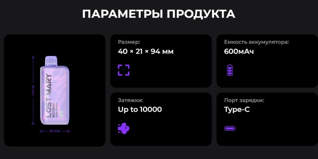 Упаковка данной модели LOST MARY MO (Лост Мари МО) 10000 представлена в ярких цветах, которые соответствуют вкусу. На ней можно встретить информацию о названии устройства, вкусе, количестве затяжек. А по изображению сразу понятно какой девайс нас ждет.