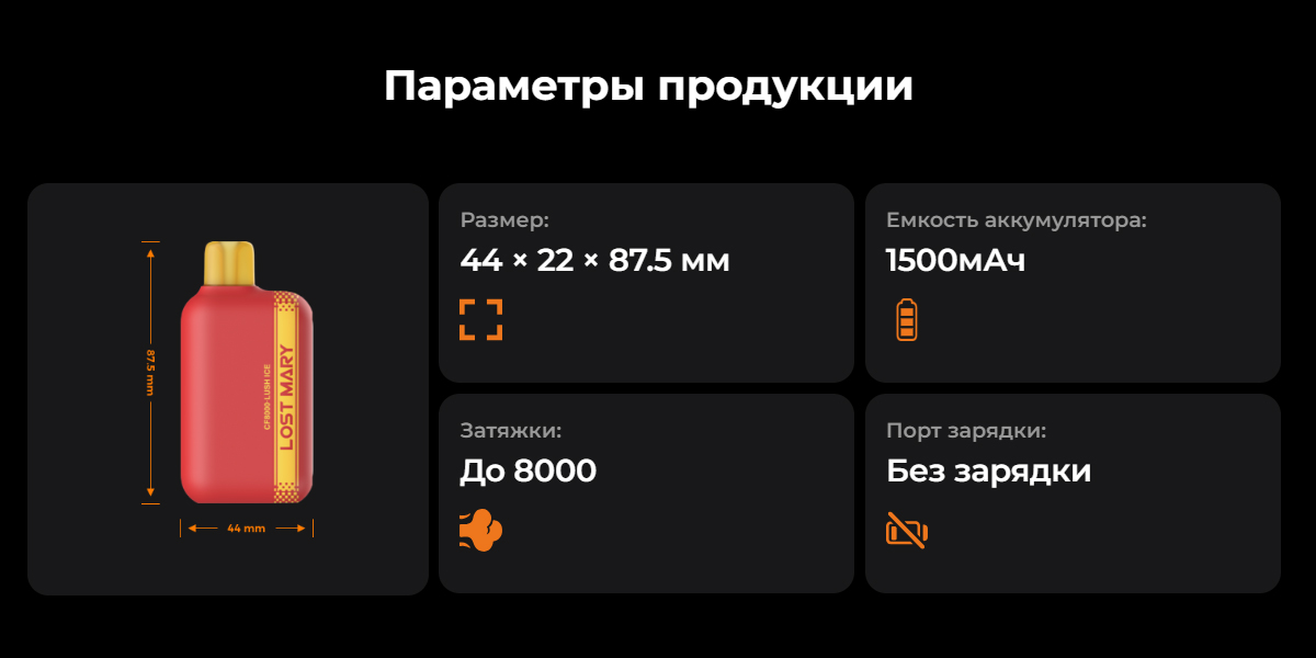Упаковка устройства прямоугольной формы, на которой изображение девайса, название бренда, количество затяжек и вся информационная характеристика для потребителя. Стиль как всегда отличается яркостью и оригинальностью. Как коробка, так и одноразовая электронная сигарета LOST MARY CF (Лост Мари ЦФ) 8000 представлена в сочных и насыщенных оттенках.