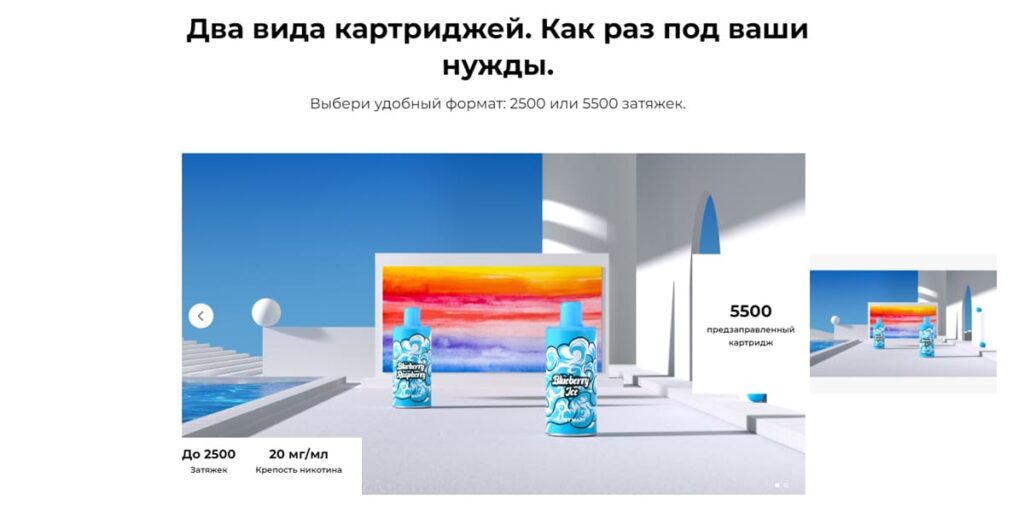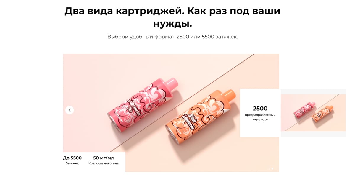 Для данной модели картриджи продаются отдельно от девайса в индивидуальной упаковке, представляют собой небольшой пластиковый бочонок, с зауженной верхней частью. Вкусовая линейка представлена из 12 вкусов с количеством затяжек на 2500 или 5500 и крепостью 20 мг или 50 мг.