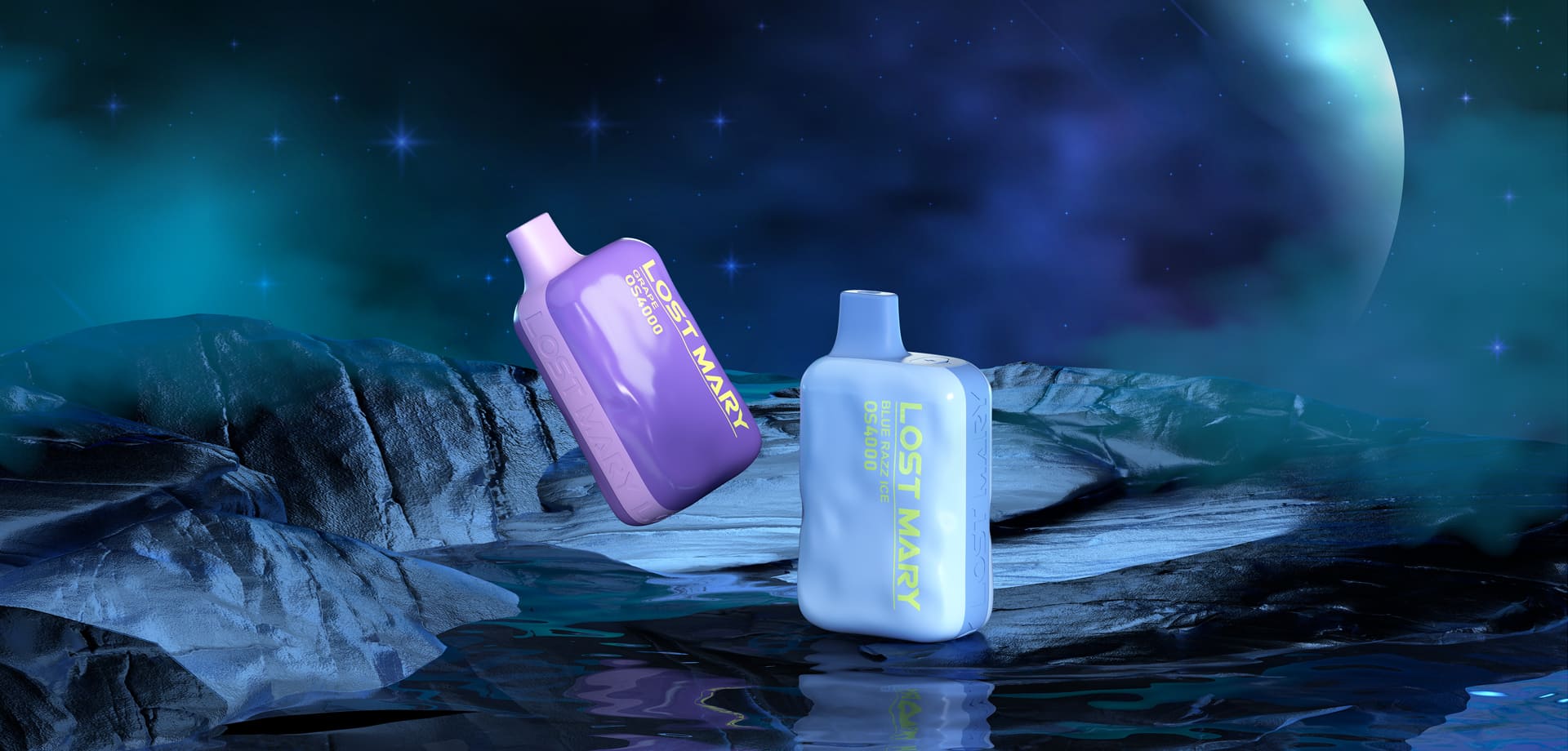 Модель LOST MARY MO (Лост Мари МО) 5000 упаковали в яркие прямоугольные коробки. На лицевой стороне изображен девайс в полный размер, также указано название модели, вкуса и количество затяжек. В нижней части упаковки на белом фоне расположено предупреждение о том, что продукт содержит никотин. На оборотной стороне указана вся стандартная информация.