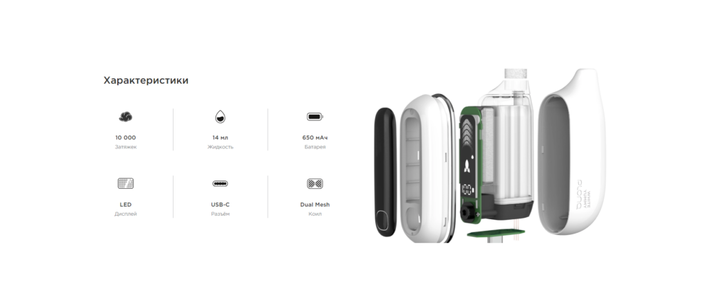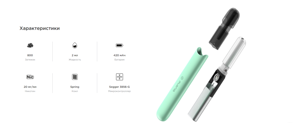 Сама электронная сигарета имеет гладкий, цилиндрический дизайн с минималистичным корпусом белого цвета и мундштуком того же, а также защитной крышкой в тон вкуса. Логотип бренда нанесен на корпус устройства, подчеркивая его идентичность.