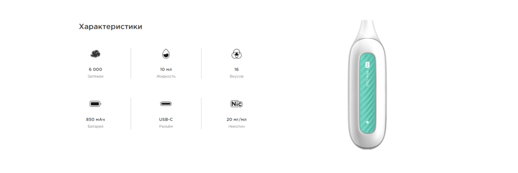 Упаковка выполнена в чистом, современном стиле с белым фоном и акцентами яркого цвета, подчеркивающий аромат На передней стороне упаковки изображено устройство внутри, а также указано количество затяжек “6000”.