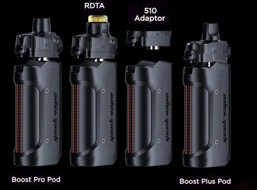Для Geekvape B100 21700 Pod Mod Kit был разработан специальный картридж, удерживаемый в батарейном блок при помощи защелки. Но производитель предусмотрел возможность установки не только комплектного картриджа под испарители серии Р, но и RDTA-картридж, картридж Boost Plus Pod и 510-й адаптер для использования традиционных баков с соответствующим коннектором.