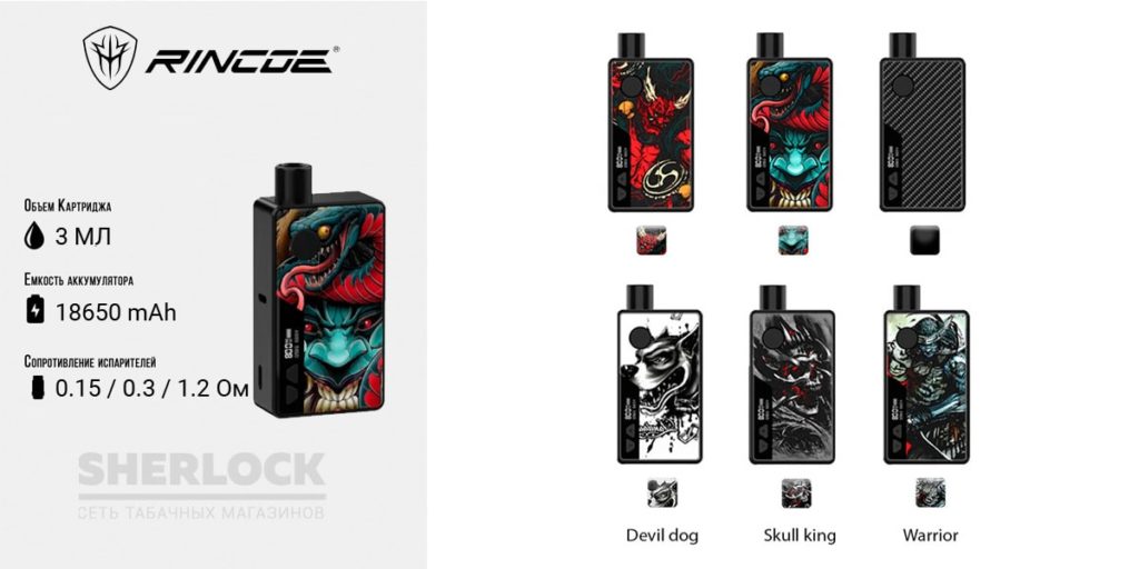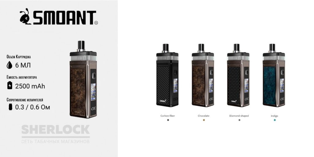 Необычный и компактный корпус, является самым маленьким среди POD-систем. Батарея мощностью 800 mAh обеспечит паром на целый день. В комплекте два сменных картриджа различных сопротивлений 0,6 и 1,2 Ом. Управление осуществляет с одной кнопки, описывается все действия на небольшом экранчике.