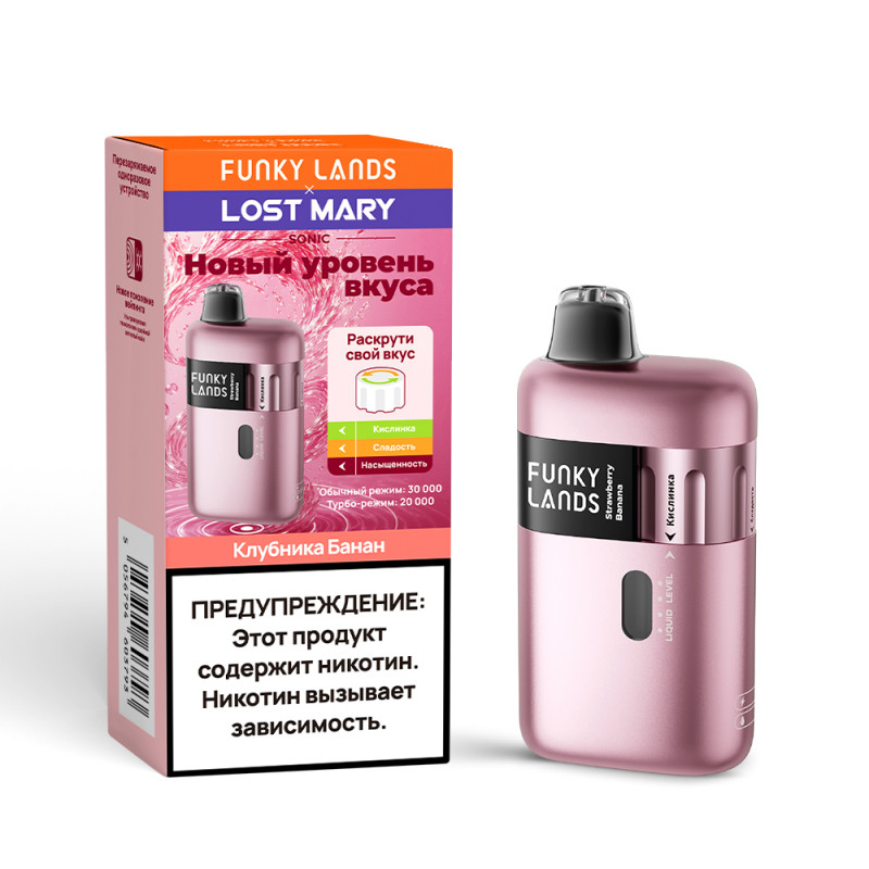 Одноразовые электронные сигареты FUNKY LANDS SONIC со вкусом Клубника банан – новинка от бренда FUNKY LANDS. Аккумулятор емкостью на 800 mAh с возможностью подзарядки через разъем USB Type-C и бак с 20 мл предзаправленной жидкости (Солевой никотин крепостью 2% (20 мг/мл)) позволяют совершить до 30000 затяжек. Хватит примерно на 60 дней