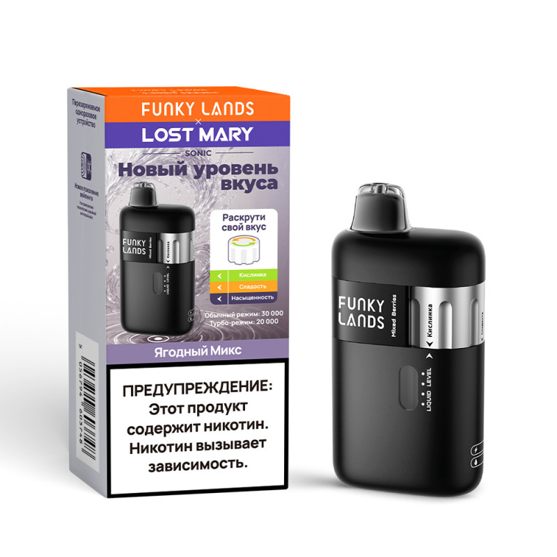 Одноразовые электронные сигареты FUNKY LANDS SONIC со вкусом Ягодный микс – новинка от бренда FUNKY LANDS. Аккумулятор емкостью на 800 mAh с возможностью подзарядки через разъем USB Type-C и бак с 20 мл предзаправленной жидкости (Солевой никотин крепостью 2% (20 мг/мл)) позволяют совершить до 30000 затяжек. Хватит примерно на 60 дней